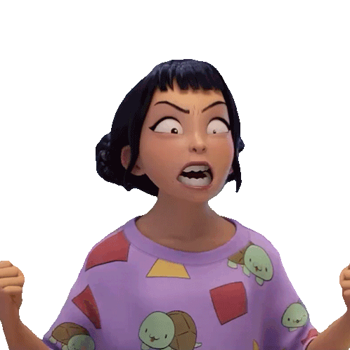 Zoey, a character from K-Pop Demon Hunters, screams with wide eyes and arms raised, wearing a purple turtle shirt.