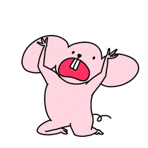 A pink cartoon mouse-like creature with large ears and prominent teeth screams with arms raised in panic.