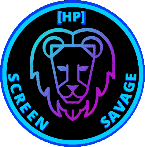 Animated Screen Savage logo sticker featuring a gradient lion head and 'HP' text, with a subtle glow effect.
