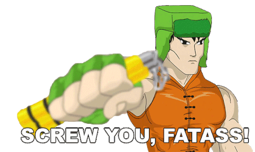 Kyle Broflovski from South Park points a weapon and declares, 'Screw You, Fatass!' in this animated sticker.