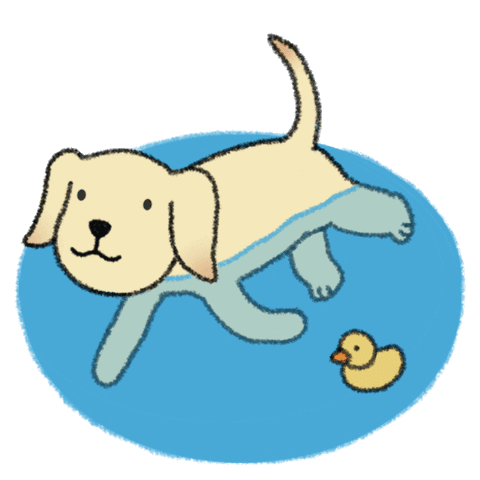 A cute cartoon dog swims happily in blue water alongside a small yellow rubber duck.