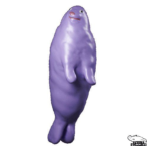 A cute, wiggling violet seal-like creature, possibly a manatee, animated by Pretty Gummies, looking around playfully.