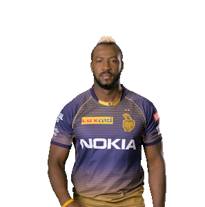 Andre Russell, the KKR cricketer, looks around intently, hand shading his eyes as if searching or observing.