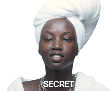 Anok Yai, wearing a towel and chain, mouths 'secret' as the word appears on screen.