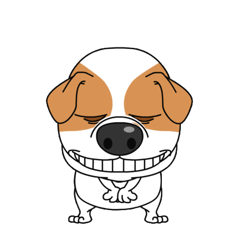 A cheerful cartoon dog with a wide, toothy grin blinks its eyes, conveying a friendly 'good afternoon' or 'see you' greeting.