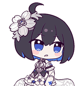 Chibi Seele from Honkai Impact changes her expression from tired to wide-eyed and surprised, wearing a white and blue dress.