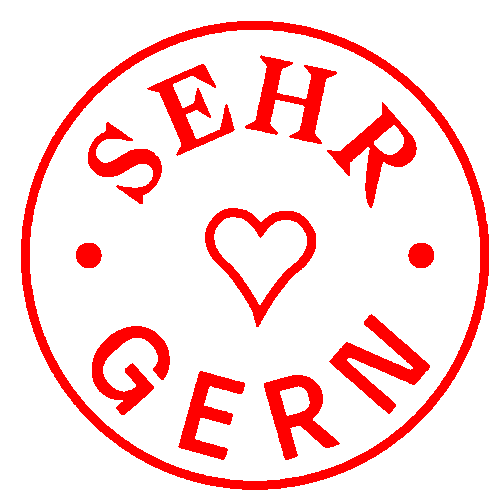 A red circular badge sticker featuring the German phrase 'Sehr Gern' (Very Gladly) and a heart symbol in the center.