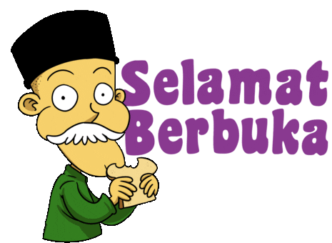 Cartoon man with peci happily eating bread, wishing 'Selamat Berbuka' (Happy Breaking Fast).
