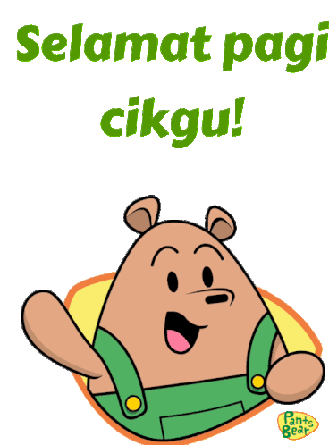 Pants Bear cheerfully waves and greets 'Selamat pagi cikgu!' (Good morning teacher!) in this animated sticker.