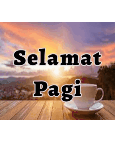 A warm "Selamat Pagi" message with a cup of coffee on a wooden table, set against a beautiful sunrise.