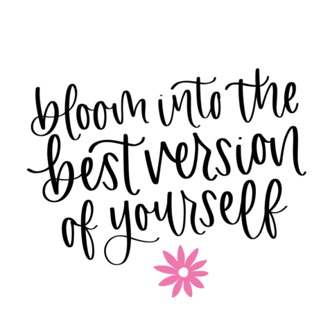 Inspiring sticker featuring the phrase 'bloom into the best version of yourself' with a pink flower, encouraging personal growth and self-improvement.