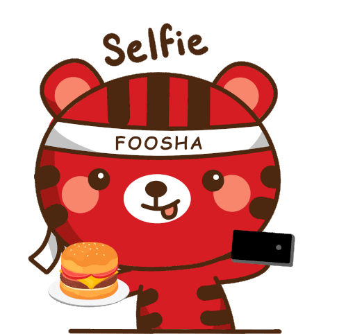 A cheerful burger character smiles while holding a phone and taking a selfie, expressing happiness and fun.