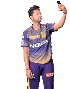 Kuldeep Yadav, the cricketer, takes a selfie with his smartphone while wearing his KKR jersey.