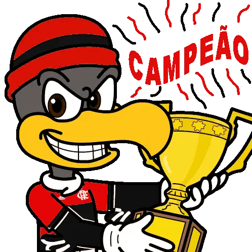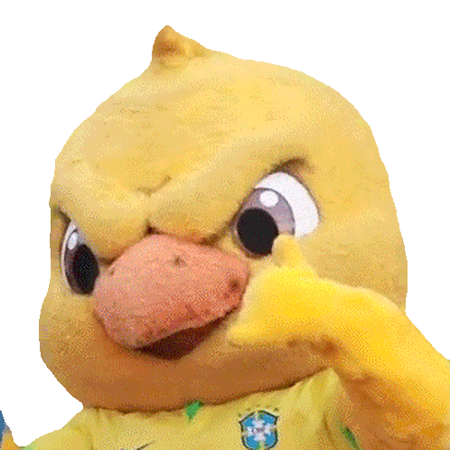 Canarinho Pistola, the Brazilian football mascot, poses for a selfie with a playful expression.