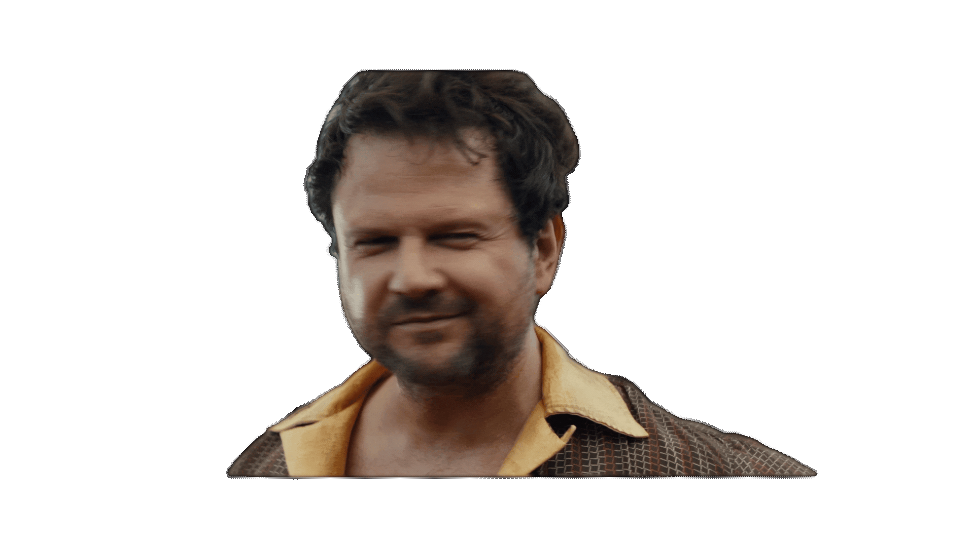 A close-up of Selton Mello as Santiago Braga, wearing a yellow-collared shirt, giving a subtle, knowing smirk and a slight nod of approval.