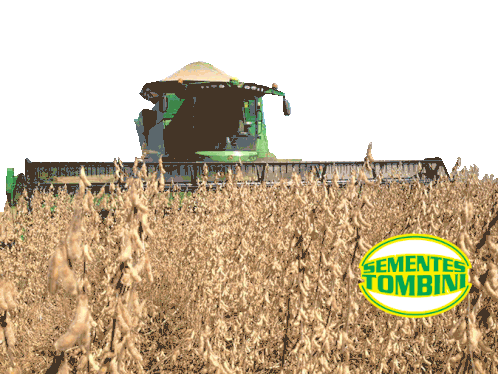 A green combine harvester works in a field of ripe soybeans, with the Sementes Tombini logo prominently displayed.