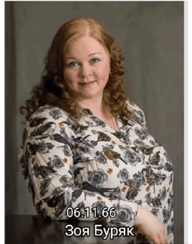 a woman in a floral shirt has the date 06.11.66 on the bottom