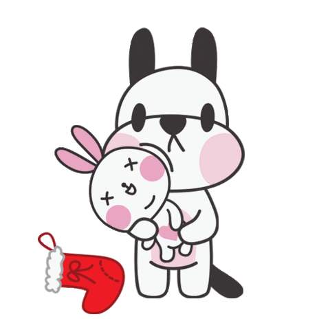 An adorable cartoon dog with pink cheeks gently hugs a white bunny plush toy, surrounded by floating pink hearts, expressing love.