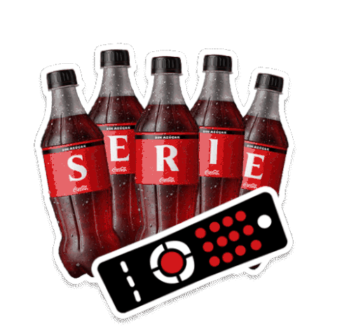 Five Coca-Cola bottles spell 'SERIE' alongside a TV remote, perfect for binge-watching your favorite shows.