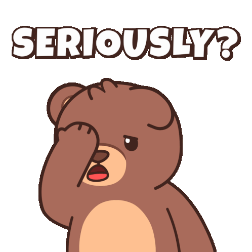 A cute brown cartoon bear with a surprised expression raises its paw, asking 'SERIOUSLY?' in disbelief.