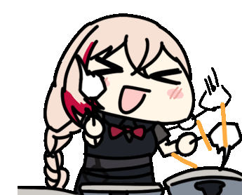 Seseren, a cute animated girl with a braid, happily drums on a pot with drumsticks, showing a cheerful smile.