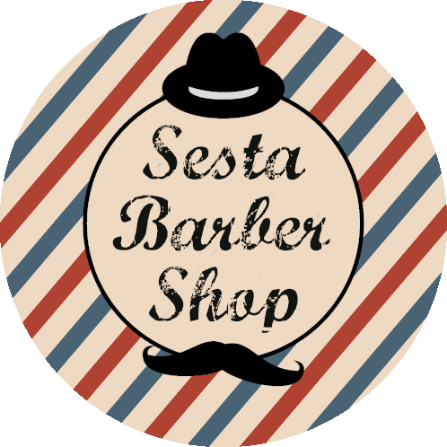Classic Sesta Barber Shop logo featuring a fedora, mustache, and barber pole stripes, perfect for grooming themes.
