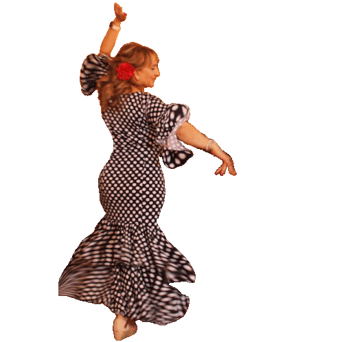 a woman in a black and white polka dot dress dancing