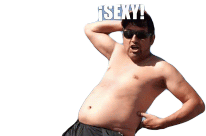 A shirtless man with a big belly, wearing sunglasses, poses confidently, pointing at his stomach with 'SEXY!' above him.