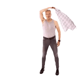 A man in a tank top dances seductively, waving a shirt above his head with a playful smile, exuding confidence.