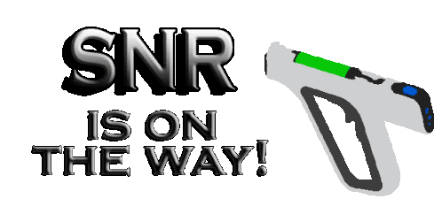 A dynamic sticker featuring the text 'SNR IS ON THE WAY!' alongside a futuristic laser gun emitting a green beam.