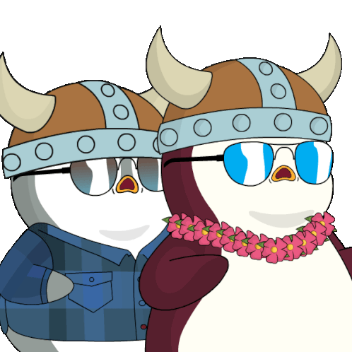 Two pudgy penguins, wearing Viking helmets and sunglasses, shake their bodies vigorously in an excited manner.