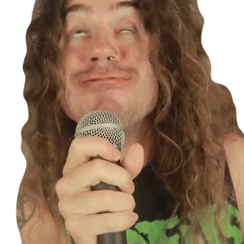Bradley Hall, with long curly hair and a nose ring, shakes his head and makes a funny, exaggerated face while holding a microphone.
