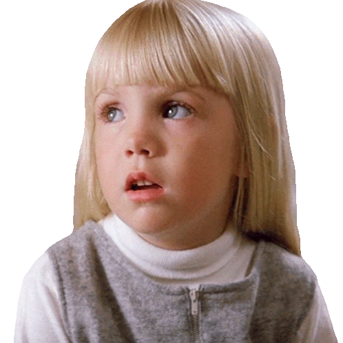 Carol Anne Freeling from Poltergeist shakes her head in disbelief or disagreement, a classic reaction.