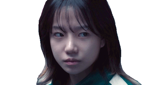 Kim Jun Hui from Squid Game Season 2 shakes her head, expressing 'no' or 'nope' with a skeptical look.