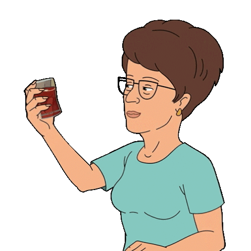 a cartoon of a woman with glasses holding a glass of red liquid