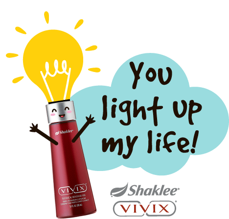 A cheerful Shaklee VIVIX bottle with a lightbulb head, spreading joy with the message 'You light up my life!'