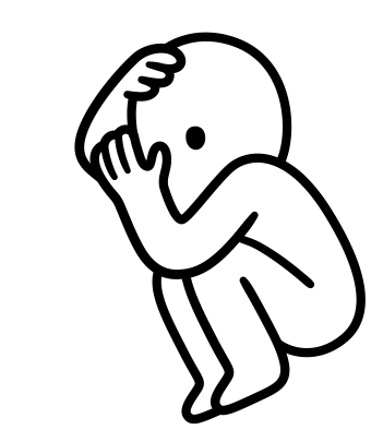 A minimalist line art figure crouches, covering its face in shame or embarrassment, with distress lines.