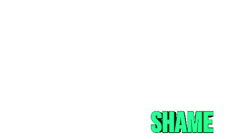 Animated green 3D text spelling 'SHAME' appears and shrinks, conveying a feeling of regret or disappointment.