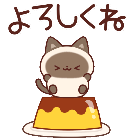 Shamu Cat, a cute feline in a Siamese costume, floats above a pudding with 'Yoroshiku ne' text and sparkling stars.