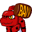 Shaoran X2000, a red dinosaur character, carries a 'BAN' barrel, an angry Twitch emote.