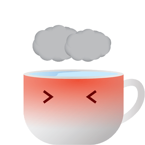 An animated BOH Tea cup transforms from angry with storm clouds to happy with a steeping tea bag, showing a mood change.