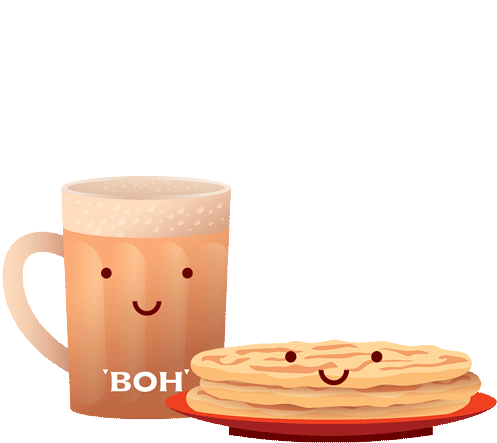 A cute animated sticker featuring a smiling BOH tea mug with the text 'BOH' and a stack of happy pancakes on a red plate.