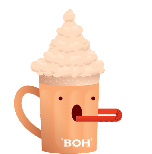 An animated BOH tea mug with a frothy topping sips a drink through a straw, making a cute kissing face and showing love for tea.