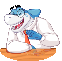 A cartoon shark boss wearing glasses and a tie, laughing heartily at a table.