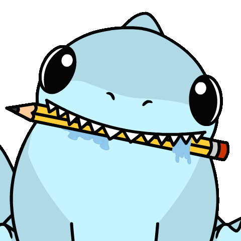 An adorable light blue landshark shark puppy with big eyes holds a yellow pencil in its mouth, drooling playfully.