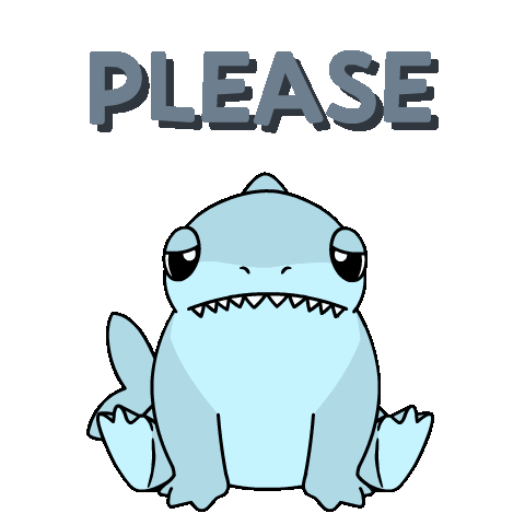 A cute, sad shark puppy from Ordinary Frends sits and blinks, pleading with the word "PLEASE" appearing above it.