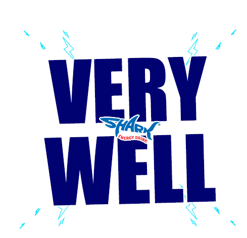 Animated text sticker displaying 'VERY WELL' in bold blue letters with the Shark Energy Drink logo.