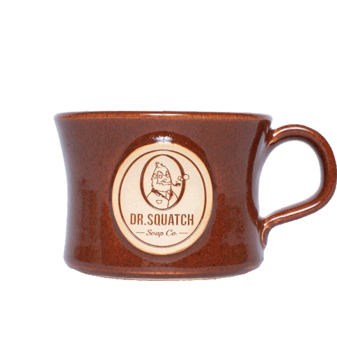 A brown Dr. Squatch shaving mug with a logo, slowly rotating. Perfect for fans of quality grooming products.