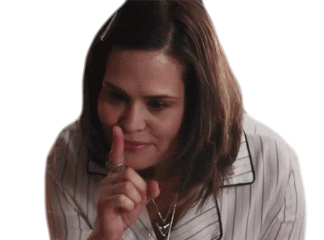 A woman in a striped shirt makes a 'shhh' gesture, bringing her finger to her lips, then smiles subtly.