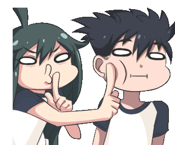 An anime couple, a girl and a boy, playfully shush with fingers on lips, emphasizing quiet with 'SSHHHHHHHHH' text.